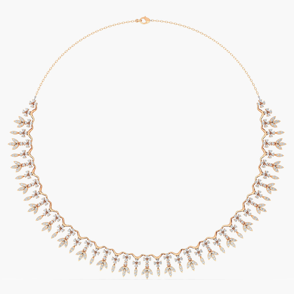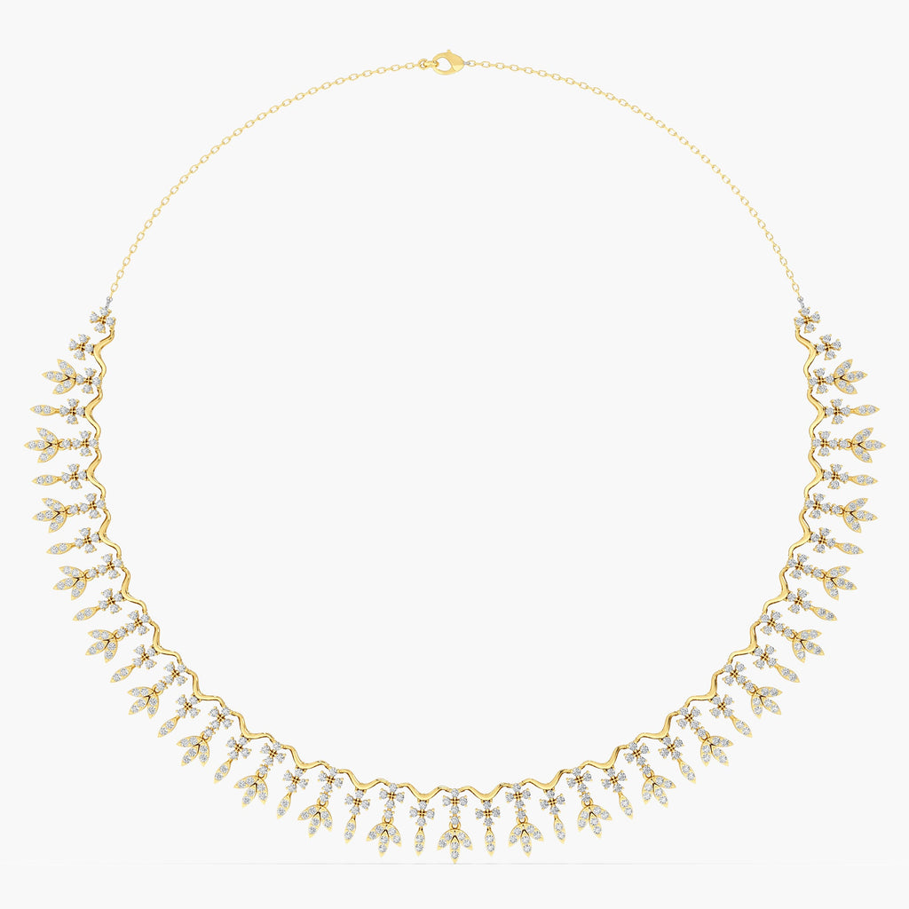 The Laurel Fringe Necklace is a masterclass in liquid movement. Crafted in warm 18K Gold, this piece features a delicate, wave-like vine anchored by a breath taking array of diamond "leaves." Every hand-set cluster is designed to catch the light with the slightest movement, creating a shimmering fringe effect that frames the collarbone with ethereal elegance. This unique fringe necklace features a cascading "vine" of brilliant-cut diamonds set in polished 18K Gold. Its flexible design allows it to sit flush against the skin, offering a continuous loop of radiance.